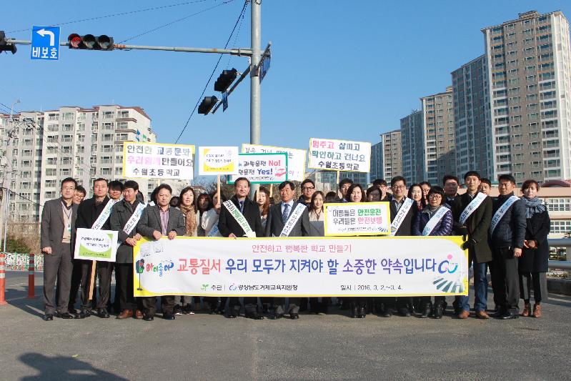수월초등학교 앞 도로변에서 실시한 이번 교통안전 캠페인에는 본교 교직원들뿐만 아니라 거제교육지원청 교육장 및 교육지원청 전 직원, 경찰, 녹색어머니회원들이 참여하였으며, 학생들이 안전한 등교를 할 수 있도록 어린이 보호구역 제한속도 지키기, 학교 앞에서 안전한 운전하기, 어린이 보호구역 내 불법 주․정차 금지 캠페인 활동을 하였다. 또한 학생들에게는 횡단보도 바로 건너기, 학교 앞 자동차 조심하기 등을 지도했다.
