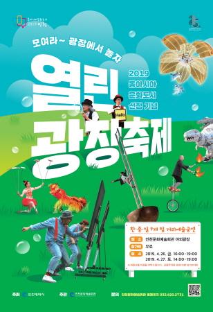 인천문화예술회관은 26일에 열리는 “동아시아문화도시 2019 인천”의 개막을 축하하며 한·중·일을 대표하는 거리예술가들이 참가하는 ‘열린광장축제’를 펼친다. 국내에서 활약하고 있는 우수한 거리예술단체 5개 팀과 중국 2개 팀, 일본 2개 팀 등 총 9개 공연 팀이 거리예술의 진수를 선보이며, 아울러 야외 광장을 활용한 체험 프로그램과 다양한 부대행사도 진행한다.