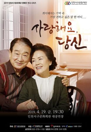 인천서구문화재단은 ‘2019 명배우 연극 시리즈 ‘사랑해요, 당신’’을 오는 19일 저녁 7시 30분, 인천서구문화회관 대공연장에서 개최한다고 밝혔다. 이번 연극은 베테랑 명배우 이순재와 정영숙이 출연하며, 평범한 일상 속에서 놓치기 쉬운 소중한 것들에 대한 따스한 감성을 전달한다.