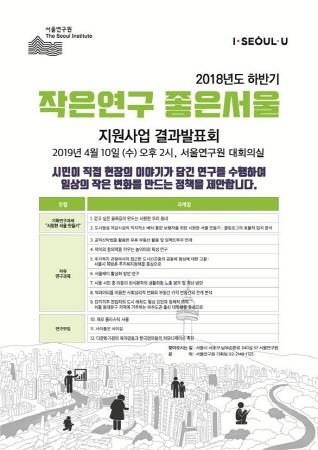 서울연구원은 오는 10일 오후 2시 서울연구원 대회의실에서 2018년 하반기에 지원한 ‘작은연구 좋은서울’ 사업 결과발표회를 갖는다.