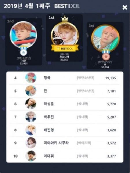 7위에는 ITZY의 유나가 머물며 조금 주춤하는 모습을 보였으며 뒤를 이어 8위에는 ‘우와’로 컴백한 다이아의 정채연이 안착했다. 꾸준히 인기몰이를 하고있는 TWICE 쯔위가 9위를 차지했으며 레드벨벳의 아이린이 쯔위와 어깨를 나란히 해 간발의 차이로 10위에 안착하게 됐다.