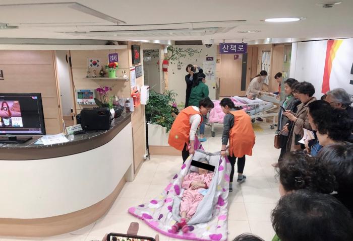 이날 화재 대비훈련은 오후 2시16분에 요양원 직원이 “불이야~”라고 외친 후 소화전호스를 펼치고 화재발원지에 물을 뿌리는 동작을 취하고 다른 직원들은 병실마다 입원해 있는 환자들을 하나하나 휠체어와 요양원 이동식침대를 이용하여 밖으로 대피하는 방법으로 일사불란하게 실전 같은 대비훈련을 진행했다.