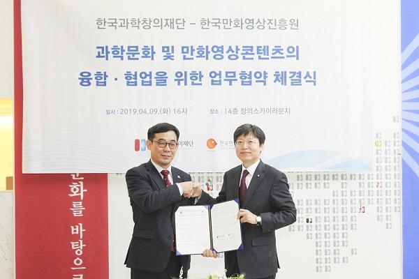 한국만화영상진흥원과 한국과학창의재단은 지난 9일 오후 4시, 한국과학창의재단 14층 창의스카이라운지에서 만화콘텐츠와 과학기술의 융합 및 협업을 도모하는 업무협약을 체결했다.
