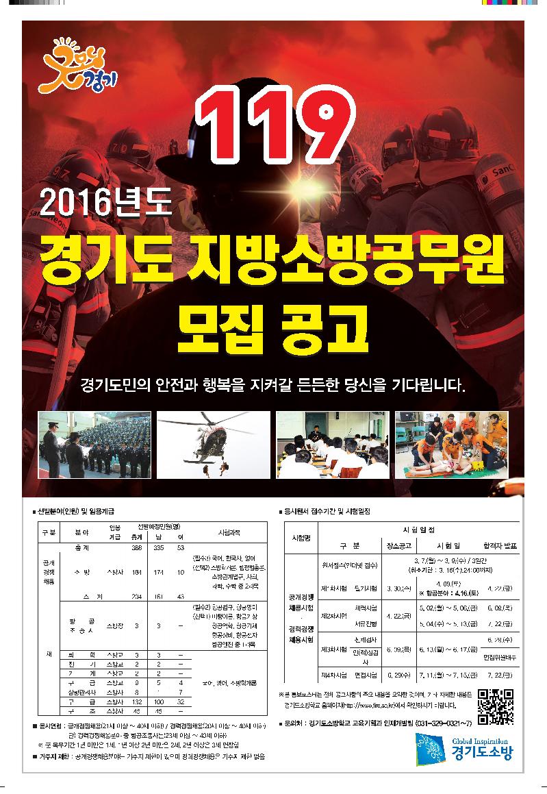 경기도는 2016년도 388명의 지방소방공무원을 선발할 계획이다. 채용규모는 공채 184명, 경력직 204명이다.