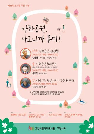 고양시 가좌도서관이 제55회 도서관주간을 기념해 오는 20일부터 5월 4일까지 매주 토요일, 도서관의 지리적 조건을 효과적으로 이용한 ‘가좌공원, 나오니까 좋다’를 진행한다.
