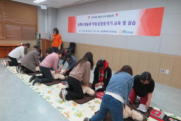 이번 교육은 급식관리센터에 등록된 관내 어린이집, 유치원 및 지역아동센터 교사 75명을 대상으로 진행됐으며, 중부소방서 소속의 김민영 소방관이 직접 강의에 나서 이론뿐만 아니라 CPR 마네킹을 이용한 심폐소생술 및 자동심장충격기 사용에 대한 실습을 실시하는 등 응급상황 시 바로 대처할 수 있도록 교육이 진행됐다.
