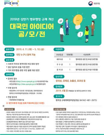 병무청은 병무행정 규제개선과제 발굴을 위해 전 국민을 대상으로 11일부터 오는 5월 10일까지 ‘2019년 상반기 대국민 아이디어 공모전’을 실시한다고 밝혔다.