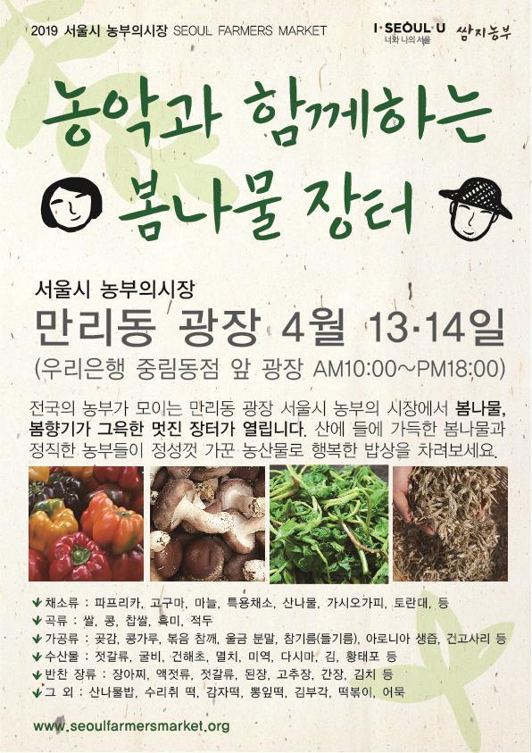 4월부터 6월에는 볏짚공예 체험, 농부의 비밀 레시피 장 만들기 체험, 씨앗 모종 나누기, 농악과 함께하는 봄나물 장터, 음악으로 빚는 봄나물 샐러드와 먹거리 나눔 등으로 농부의 시장을 풍성하고 다채롭게 만든다.