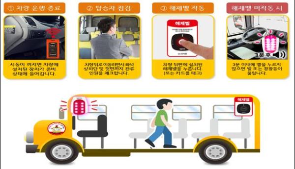 어린이 통학버스 운전자의 부주의로 통학버스 내 어린이가 방치되어 사망하는 사고를 방지하기 위해, 2018년 10월 16일 도로교통법을 개정했다. 개정된 도로교통법에는 어린이 통학버스 운전자 하차확인장치 작동의무 및 벌칙규정을 신설했다.