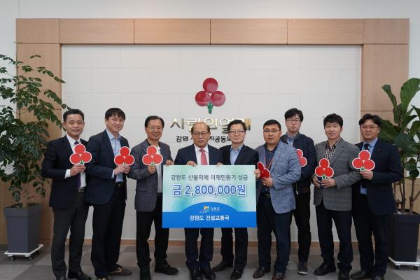 강원도 건설교통국은 15일 오전 10시 30분, 강원도 사회복지공동모금회에 4월 4일 발생한 동해안 대형산불에 따른 이재민 구호를 위한 성금 280만원을 모금해 전달했다.
