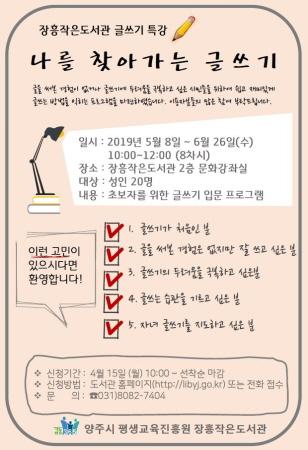 양주시 장흥작은도서관은 오는 5월 8일부터 6월 26일까지 2개월에 걸쳐 글쓰기 입문 프로그램인 ‘나를 찾아가는 글쓰기’를 운영한다.