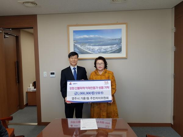 또한, 최근에 벤치마킹을 위해 강릉시를 방문했었던 경상북도 영주시 가흥1동 주민자치위원회에서 이번 산불 피해 소식을 듣고 100만원 상당의 성품을 전달했다.