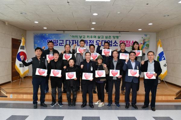 ‘양평군 다자녀가정 우대업소’는 다자녀 가정 양육에 따른 경제적 부담을 경감하고 다자녀 가정에 대한 사회적 우대분위기를 조성해, 출산장려 분위기 조성에 기여하고자 양평군에서 대표적으로 추진하고 있는 민간 참여사업으로 2012년 관내 단체들의 협약을 통해 시작으로 이번 24개 업소가 추가로 참여해 총 187개소를 지정 운영하고 있다. 업소들은 ‘양평군 다자녀가정 우대카드’를 소지한 다자녀가정이 업소 이용시 5~20%까지 자발적인 할인율로 할인해주고 있다.