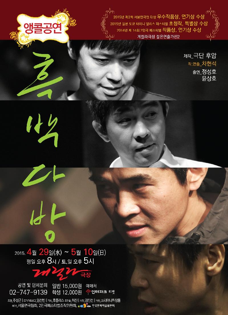 극단 후암 제작의 ‘흑백다방’ 앵콜 공연이 29일 대학로 게릴라 극장에서 열린다. 삶의 부조리, 우리 시대 복수의 자화상 ‘흑백다방’ 무대는 LP판과 오랜 팝가수들의 이미지가 과거 7080세대를 컨셉으로 터미널 옆의 한 다방으로 안내하는 연극 ‘흑백다방’은 상처를 입은 자가 자신을 가해 한 자를 20년 만에 찾아 벌어지는 진실 공방은 두 인물을 가해자와 피해자로 가르며 서로의 아픈 기억을 들춘다. 2014년 11월 14년째를 맞이한 ‘2인극 페스티벌’에 참가해 창작 초연으로써 차현석 작·연출의 작품상 수상과 배우 정성호와 윤상호의 열연으로 연기상까지 휩쓸며 주목 받았다. 특히 작·연출을 맡은 극단 후암의 ‘차현석 대표’는 우리 시대의 아픔을 간결하면서도 위기를 위안과 용서로 부드럽게 화해시켜 극적 연출력이 높게 평가 받았다. 이번 공연은 그 인기에 힘입은 앵콜 공연이라는 데 그 의의가 크다. 한편 연극 ‘흑백다방’은 일본의 엘리스페스티벌 이라는 연극축제에 특별공연으로 초청되어 3/30월 도쿄 타이니 엘리스 극장 공연도 사전 매진되어 성황리에 마치고, ‘특별상’을 받았다. 도쿄 도심의 지하 소극장에서 열리는 ‘타이니 앨리스 페스티벌’은 30년 넘게 이어져온 축제로 한일관계가 불편한 때에도 한국 연극을 꾸준히 올리며 명성을 이어왔다. 오태석, 이윤택, 박근형 등 우리나라를 대표하는 연출가의 작품이 이곳을 통해 일본에 처음 소개됐으며 사카테 요지 등 일본 연극계 중진도 ‘앨리스’가 발굴했었다. 흑백다방은 2015년 종로구 우수연극축제 작품으로 하반기에 초청되었으며, 제2회 서울연극인 대상에서 우수 작품상, ‘연기상’을 수상하는 쾌거를 이뤘다. 또한 영화제작이 확정되어 올 가을 크랭크인에 들어간다. 극단 후암이 제작, 대학로스타시티극장 주관, 주)후플러스 기획의 연극 ‘흑백다방’은 대학로 게릴라 극장에서 2015년 4월 29일(수)부터 5월 10일(일)까지 올려진다. 공연 개요 제목: 흑백다방