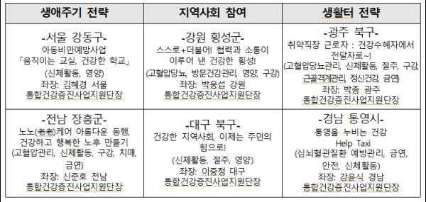 서울 강동구 등 6개 지방자치단체가 통합건강증진사업 성공사례를 발표해 ‘생애주기별 전략’, ‘지역사회 주민참여방안’, ‘생활터별 접근방식’ 등 생생한 경험을 지역 간 공유하고 소통할 수 있도록 했다.