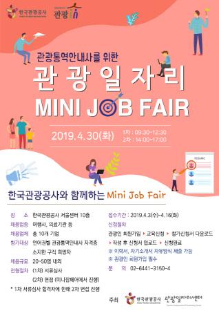 한국관광공사는 오는 30일 중구 청계천로 공사 서울센터에서 관광분야 일자리 매칭 지원을 위한 ‘미니잡페어’를 개최한다.