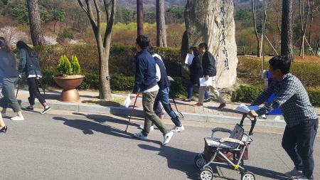이날 직원들은 유니버설디자인 교육을 받은 뒤 아동, 노인, 임산부·장애인 등 사회적 약자 체험키트를 착용하고 휴양림 내 공원과 산책로, 화장실 등을 다니며 어떤 점이 불편한지를 직접 확인했다.