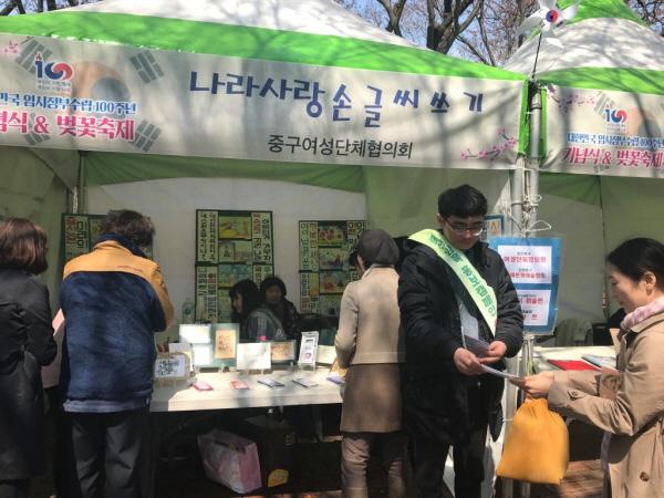 이날 중구 공무원 및 인천중구여성단체협의회 회원 20여 명이 한자리에 모여 행사 참여 구민들을 대상으로 나라사랑 캘리그라피 행사와 더불어 중구의 출산·육아프로그램 홍보 리플릿을 배부하며 출산장려 가족 친화 사업을 홍보했다.