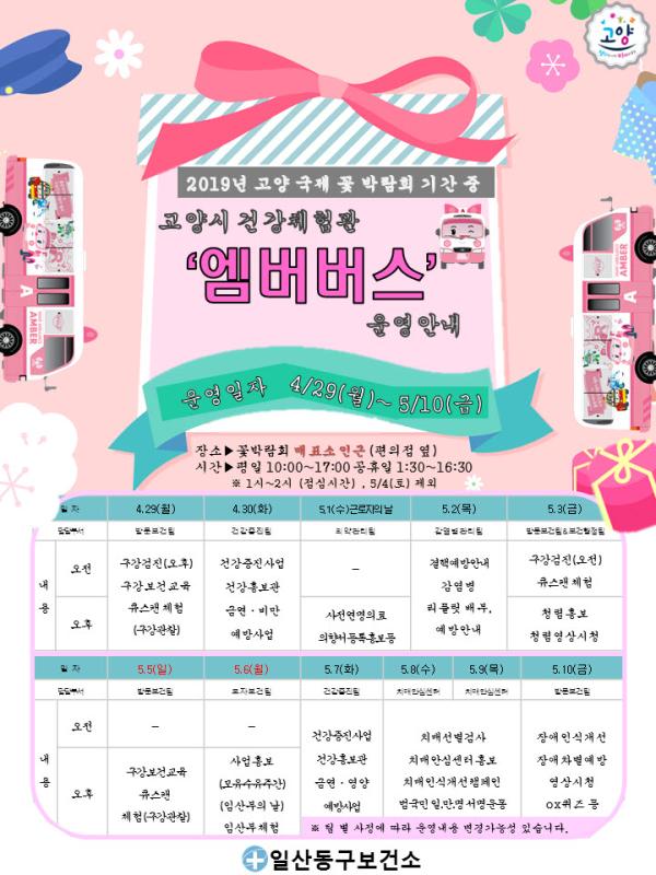 고양시 일산동구보건소는 오는 29일부터 5월 10일까지 ‘고양국제꽃박람회’ 기간 동안 관람객 등을 대상으로 일산 호수공원 꽃박람회 매표소 인근에서 고양시 건강지킴이 ‘엠버버스’를 운영한다.