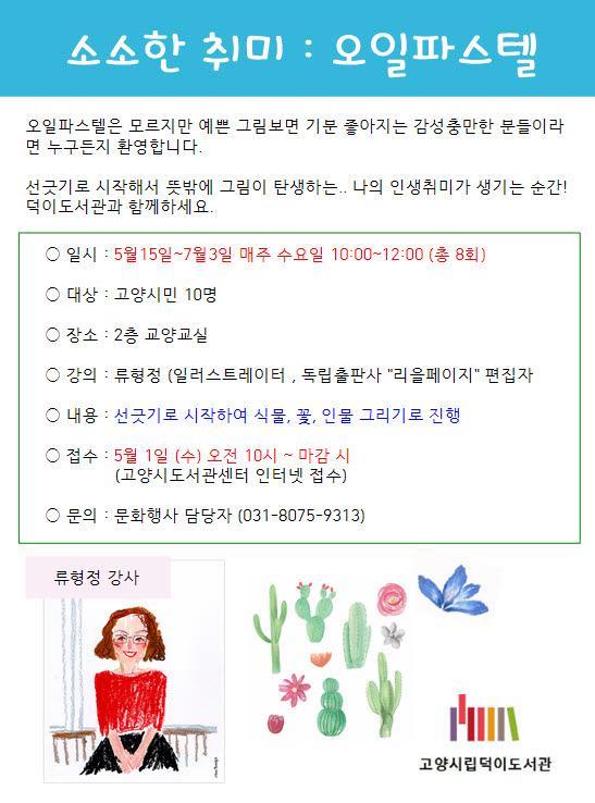 고양시 덕이도서관은 오는 5월 15일부터 7월 3일까지 매주 수요일에 고양시민을 대상으로 ‘소소한 취미:오일파스텔’ 강좌를 운영한다.