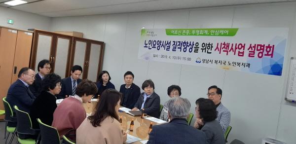 성남시는 17일 오후 3시 야탑동 성남고령친화종합체험관에서 ‘노인요양시설 서비스 질적 향상을 위한 시책 사업 설명회’를 했다. 이날 설명회는 성남지역 노인의료복지시설 49개소 시설장, 재가 노인 주야간보호센터 12개소 시설장 등 모두 100여 명이 참석했다.