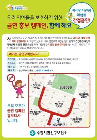 선일초등학교 주변 약 800m는 2016년 11월부터 ‘수원시 금연구역 등에 관한 조례’에 따라 금연거리로 지정됐다. 이날 캠페인 참가자들은 시민들에게 금연거리와 해당 구역에서 흡연할 경우 5만 원의 과태료가 부과됨을 알렸다.