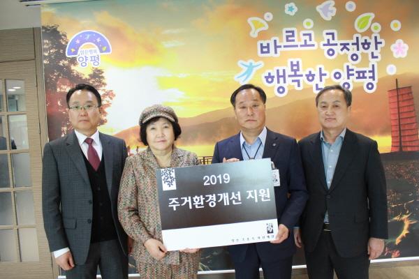 지난 16일 양평군청 군수 집무실에서 열린 주거환경 개선 지원 보드판 전달식에서 영산 조용기 자선재단 김성혜 이사장은 “양평 지역에서 노후화된 주거 환경으로 어려움을 겪고 있는 주민분들이 재단 지원을 통해 쾌적한 환경에서 건강하게 보내실 수 있기를 바란다.”는 소감을 전했고. 정동균 양평군수는 “우리지역의 생활이 어려운 주민들을 위해 이렇게 커다란 나눔을 실천해 주시는 재단에 감사드린다. 군에서도 어려운 이웃을 위해 최고의 복지서비스를 제공할 수 있도록 지원을 아끼지 않겠다.”고 답했다.