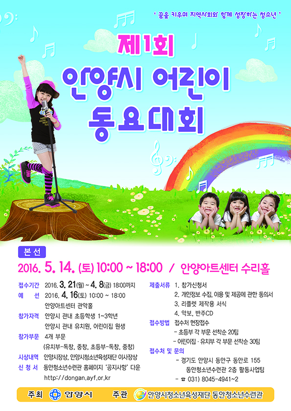 신청서는 동안청소년수련관 홈페이지(http://dongan.ayf.or.kr) 공지사항에서 확인할 수 있다. 동요대회 관련 자세한 사항은 동안청소년수련관