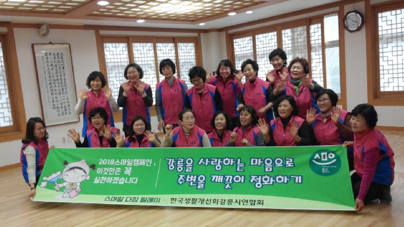 동계올림픽 성공개최를 위한 강릉시민 스마일캠페인은 자발적 시민참여와 스마일운동 확산을 위해 농업인뿐만 아니라 강릉시 각계각층의 단체별로 UCC촬영을 통한 다짐 릴레이로 진행되고 있으며, 한국생활개선강릉시연합회는 시 및 읍면동 임원들과 함께 ‘강릉을 사랑하는 마음으로 주변을 깨끗하게 정화하기’ 문구로 스마일운동 확산 및 농업농촌 환경정화 실천다짐을 하였다.