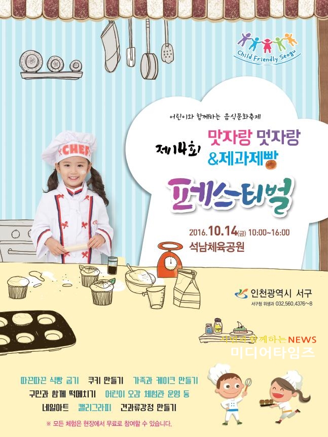 [미디어타임즈=문상수 기자]인천광역시 서구(구청장 강범석)는 주민과 함께하는 제14회『맛자랑 멋자랑 & 제과제빵 페스티벌』행사를 오는 10월 14일 석남체육공원에서 개최한다. 이번 행사는 어린이요들단, 밸리댄스 등 식전공연을 시작으로 구민이 하나되는 잡채퍼포먼스, 서구 대표 맛있는 집 음식 시식회, 식품제조가공업체 생산품 전시 및 판매, 자장면 행복 나눔, 천연조미료 및 견과강정 만들기 등 체험 프로그램으로 다양하게 진행된다. 특히 이번 축제에는 대한제과협회 서구지부에서 대형 오븐을 설치하여 행사장을 찾은 주민과 함께 즉석에서 식빵, 쿠키, 꽈배기 등을 굽는 등 다양한 체험을 준비하고 있어 구민들에게 새로운 즐거움을 선사한다. 또한 서구보건소, 관내 병원 5개소와 연계하여 건강체험관을 운영하여 구민의 건강관리에 힘쓸 예정이다. 구 관계자는 “다양한 프로그램을 준비했으니 많은 분들이 행사장을 찾아서 서구의 맛과 멋을 즐기시길 바란다”며, “아울러 행사장인 석남체육공원의 주차공간이 부족하여 대중교통을 이용하여 행사장을 방문하시면 더 즐거운 관람이 될 것”이라고 전했다.