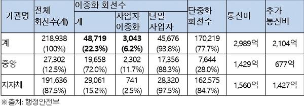 행정안전부 자료에 따르면 올해 2월 기준 정부 행정기관 중 통신망이 이중화되어있는 곳은 22.3%에 불과하며, 여기서 단 6.2%만이 사업자 이원화가 되어있다.