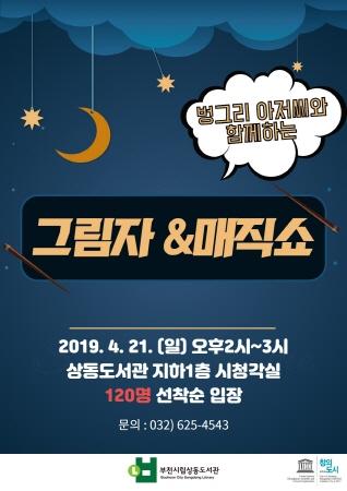 부천시립상동도서관에서는 도서관 주간을 맞아 오는 21일 오후 2시 온가족이 즐길 수 있는 ‘그림자&매직쇼’를 공연한다.