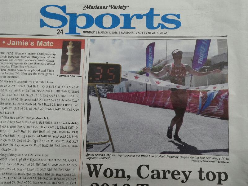 하프아이언부문 남자프로부에 원재연 선수가 4시간 41분 35초로 1위, 하프아이언부문 여자프로부에 이하연 선수가 5시간 35분 43초로 5위, 올림픽코스 여자엘리트부에 김규리 선수가 2시간 19분 53초로 1위의 영광을 안았다. 선수들은 32도가 넘는 무더운 날씨에도 불구하고 4~5시간을 달렸으며 그동안 갈고닦은 실력을 타가맨 대회를 통하여 유감없이 발휘하였다. 사이판 현지 언론인 Marianas Variety 신문에서도 원재연 선수의 활약을 크게 다루었다.