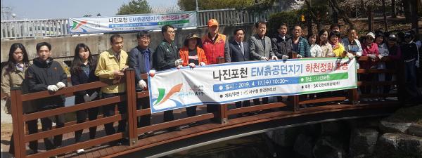 인천 서구는 지난 17일 나진포천에서 주민, SK인천석유화학 직원, 공무원과 구의원 등 100여명이 참여한 가운데 하천 정화를 위한 EM 흙 공 2천여 개를 던지는 행사를 가졌다.