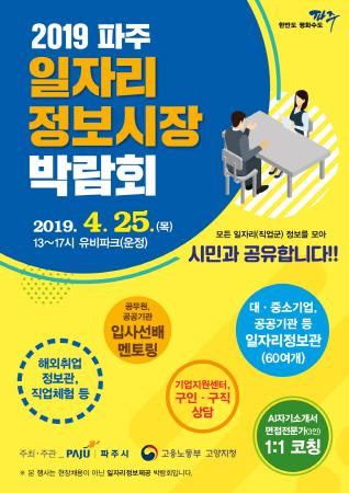 파주시와 고용노동부 고양지청이 공동으로 주최·주관하는 ‘2019 파주 일자리 정보시장 박람회’는 현장채용 형태로 진행됐던 기존 채용박람회와 달리 공공기관, 공사·공단, 대기업, 중소기업, 사회적경제기업 등 모든 분야의 일자리를 한 자리에 모아놓고 구직·채용자간 정보를 공유하는 형태로 진행된다.