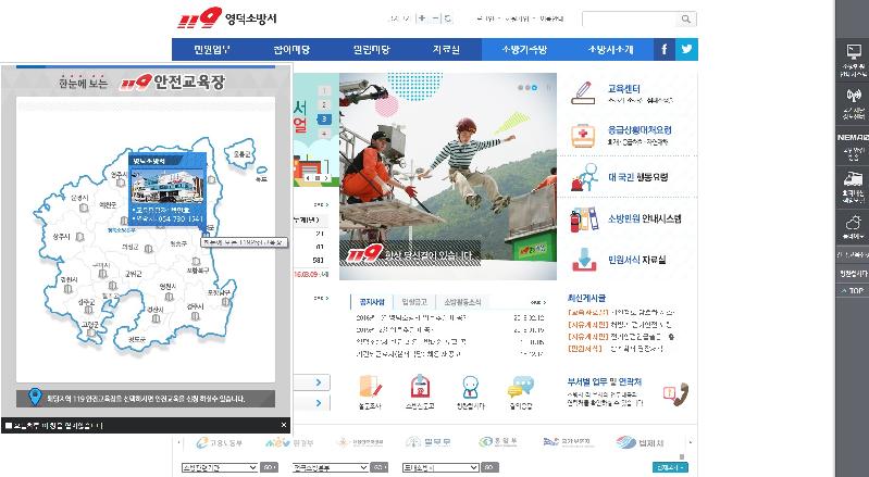 기존 홈페이지는 교육 및 견학신청 시 회원가입 등 여러 단계를 거치게 되어 있어 접근성이 낮아 불편 사항들이 있었다. 이러한 불편 사항을 개선하기 위해 홈페이지 내 “119안전교육장 콘텐츠”를 제작, 경상북도 지도를 통한 도내 안전교육장을 한눈에 볼 수 있도록 구성하여 소방안전교육 및 견학 신청접근성을 향상시켰다. 또한 전 소방서를 한 눈에 보며 가장 가까운 119안전교육장을 확인하고 교육을 받고자 하는 지역을 클릭 시 해당 관서 담당자 이름과 전화번호를 확인 할 수 있어 교육신청을 쉽게 하도록 구성하였다.// 김재광 기자 gudtks741852@naver.com