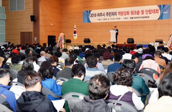 파주시는 지난 17일 월롱100주년기념체육관에서 각 읍·면·동 주민자치위원 및 관계공무원 350여명이 참여한 가운데 ‘2019년 파주시 주민자치 역량강화 워크숍 및 단합대회‘를 개최했다.