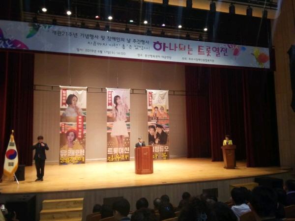 1부 기념행사는 모범장애인과 장애인복지 증진을 위해 기여한 유공자 15명에 대한 파주시장 및 국회의원, 파주시의회의장상 등의 표창이 전달돼 그간의 활동을 격려했다. 2부 문화공연은 ‘하나되는 트롯열전’이라는 주제로 관객과 소통하는 행사가 진행됐다.