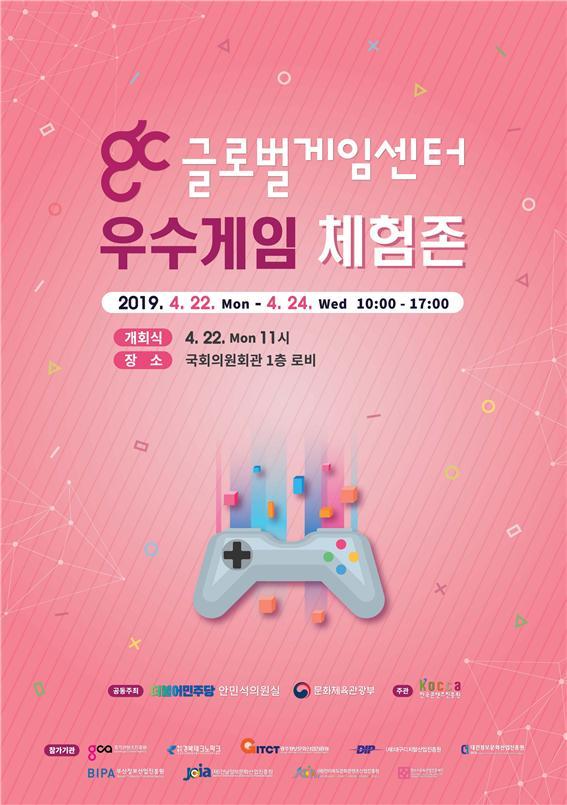 문화체육관광부와 국회 안민석 문화체육관광위원장 의원실이 주최하고 한국콘텐츠진흥원이 주관하는 ‘글로벌게임센터 우수게임 체험존’이 오는 22일부터 24일까지 국회 의원회관 1층 로비에서 운영된다.