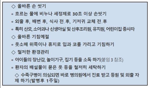 질병관리본부 정은경 본부장은 집단생활을 하는 어린이집 및 유치원에서 수족구병 예방관리를 더욱 철저히 하고, 올바른 손씻기 등 개인위생수칙을 준수할 것을 당부했다.