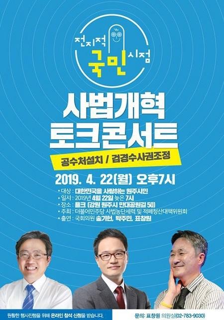 더불어민주당 사법농단 세력 및 적폐청산 대책 특별위원회가 오는 22일 오후 7시 강원도 원주시 무실동에 위치한 카페 ‘욜크’에서 ‘전지적 국민시점, 사법개혁 토크콘서트-원주편’를 개최한다.