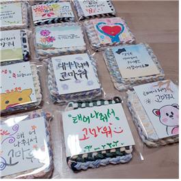 혜움 청소년방과후아카데미 청소년들과 연천군 청년, 청소년, 실버세대로 구성된 자원봉사단체인 Y.YAS와 함께 진행한 이번 활동은‘해피사이클 업사이클링’프로젝트란 주제로 업사이클링 공예를 활용해 캘리그라피카드와 핸드메이드 티코스터를 직접 제작해 관내 출산임박 임산부·태아에게 전달하는 행사로, 연천군 업사이클링 공예 교육업체인 아우라지에서 공예재료 양말목과 캘리그라피카드지를 제공했고, 혜움 청소년방과후아카데미 청소년 30여명이 참여했다.?