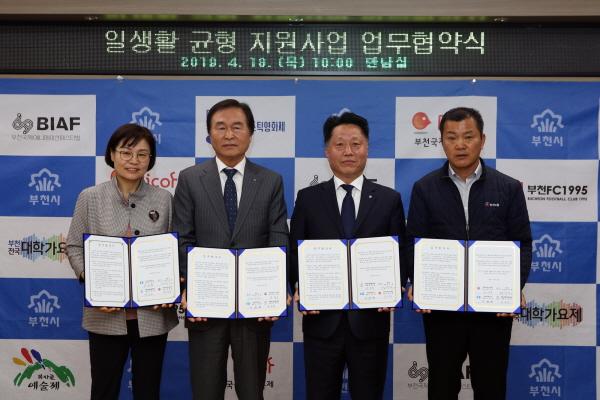 부천시는 지난 18일 시청 만남실에서 부천상공회의소, 한국노총부천김포지역지부, 부천여성청소년재단과 ‘일·생활 균형지원 사업 활성화를 위한 업무협약’을 체결했다.
