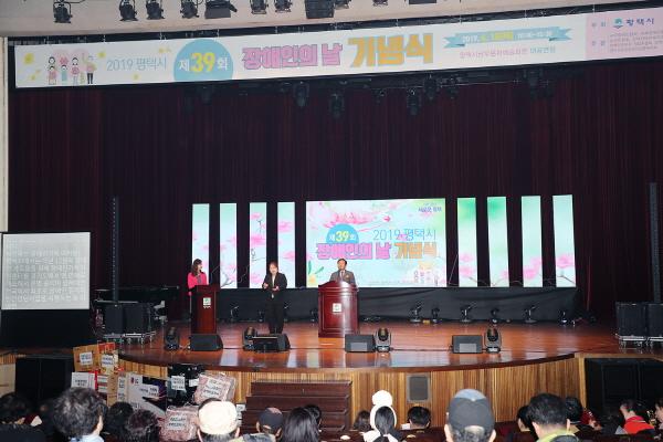 평택시는 지난 18일 남부문화예술회관 대공연장에서 장애인의 날을 기념해 장애인과 가족, 자원봉사자, 시민 등 1,000여명이 참석한 가운데 평택시 장애인 8개 단체가 합동으로 ‘제39회 장애인의 날 기념식 및 소통의 행사’를 개최했다.