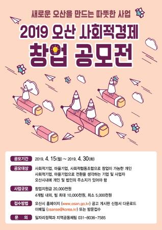 경기도 오산시는 지역의 문제를 해결하고 일자리를 창출하는 사회적경제 창업 지원을 위해 ‘새로운 오산을 만드는 따뜻한 사업 2019 오산 사회적경제 창업 공모전’을 개최한다고 밝혔다. 사회적경제는 삶의 질 증진, 빈곤, 소외 극복 등 사회적가치 실현을 위해 협력과 호혜를 바탕으로 하는 경제 조직들의 네트워크이자 경제 순환 시스템이며, 사회적기업, 협동조합, 마을기업 등이 있다.