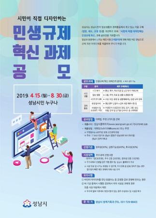성남시는 오는 8월 30일까지 ‘시민이 직접 디자인하는 민생규제 혁신 과제’를 공모한다고 22일 밝혔다.