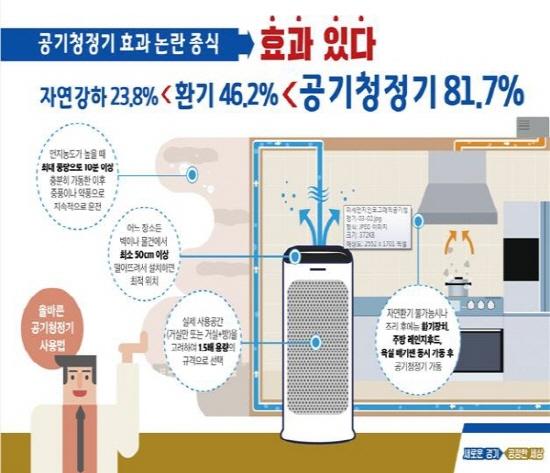 실험 결과 실내 면적에 맞는 적정 용량의 공기청정기를 가동할 경우, 미세먼지 제거율은 81.7%로 환기나 자연강하보다 미세먼지 제거 효율이 높은 것으로 나타났다.