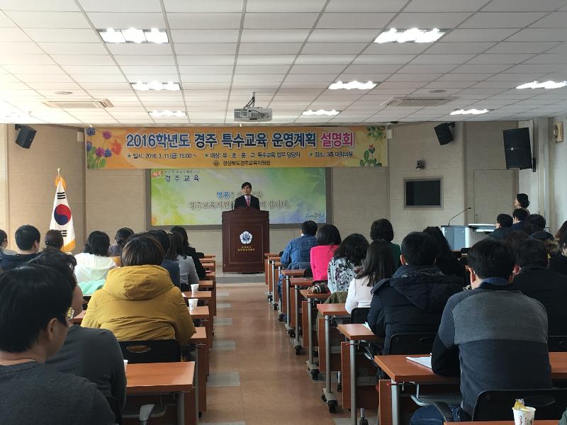경상북도경주교육지원청(교육장 구종모)은 2016년 3월 11일 금요일 15시부터 경주교육지원청 3층 대회의실에서 유, 초, 중, 고 특수교육 업무 담당자 등 90여명을 대상으로 경주 특수교육 운영계획 설명회를 개최하였다. 이날 설명회에서는 경주교육지원청 특수교육담당 최점화 장학사가 특수교육 교육력 및 성과 제고, 특수교육 지원 고도화, 장애학생 인권친화적 분위기 조성, 장애학생 능동적 사회참여 역량 강화 등 중점사항과, 특수교육 관련 행사 및 연수일정을 전달하였다. 이후 이어진 질의응답 및 자유토론 시간을 통해 특수교육 업무 담당교사들의 의견을 수렴하는 시간을 가졌다. 장광규 교육지원과장은 “교육지원청은 특수교육대상학생이 적합한 교육을 제공 받을 수 있도록 특수교육과정 운영과 특수교육관련서비스 제공에 대한 지원을 강화할 것이다.”라고 말했다. 이번 설명회를 통해 2016학년도 경주특수교육의 내실을 다지고 현장의 좋은 의견들을 수렴할 수 있는 좋은 기회가 되었다.// 김희철 기자 khc4236@hanmail.net