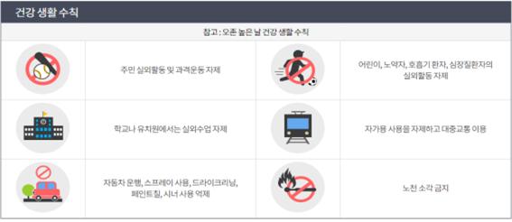 이성모 보건환경연구원장은 “야외활동이 많아지는 여름철에는 미세 먼지가 낮아지지만 오존과 같은 2차 생성 대기오염 또한 주의해야 한다.”라며, “앞으로도 대기오염 정보를 수시로 참고해 건강피해를 줄일 필요가 있다. 연구원은 상황실 집중운영과 예보제를 통해 시민 건강피해 저감노력을 지속할 것”이라고 말했다.