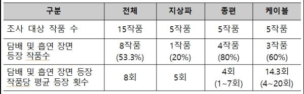 또한, 담배 및 흡연 장면이 있는 작품만 비교한 결과, 지상파 드라마는 평균 5회, 종편 드라마는 평균 4회 담배 및 흡연 장면이 등장했고, 특히 케이블 드라마는 평균 14.3회 등장해 다른 채널에 비해 등장 빈도가 월등히 높았고, 심지어는 청소년이 흡연하는 장면도 2회 방영되기도 했다.